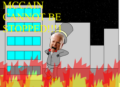 In the days of blabbering politicians, this story formed. John McCain became angry and started attacking people and knocking down buildings. While we watch, we keep getting pestered by the Magikarp salesman about buying a terrific robot. McCain has a calm experience in space before all the madness resumes, then the robot goes bezerk, and while McCain is rocking out, It transforms into Faggoherpes, who ends up killing McCain.